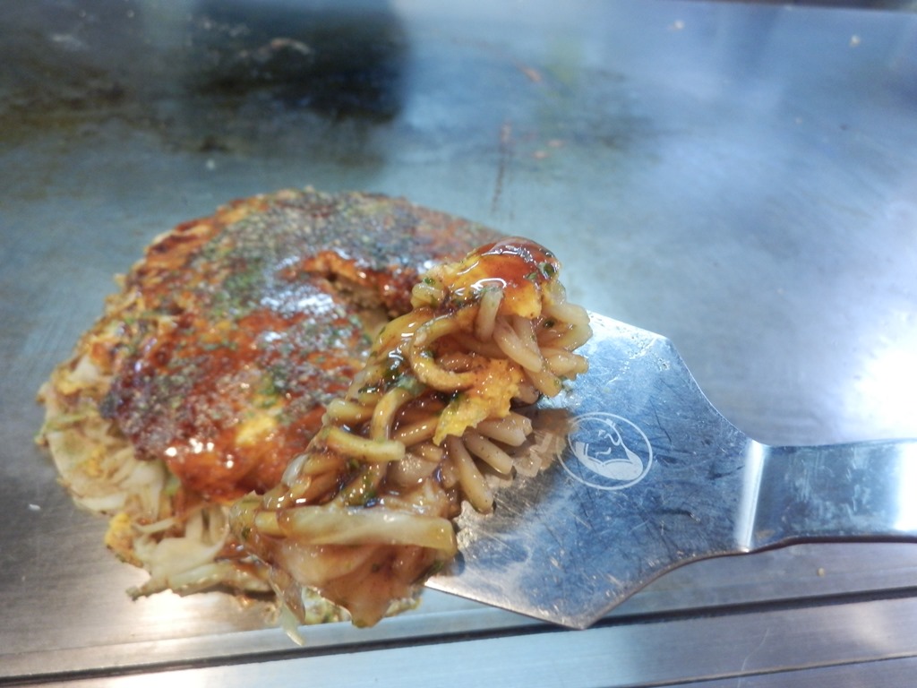 このお好み焼き、キャベツの焼け具合がちょうどいいですね。ちょうどいいというのが、キャベツが柔らかいのですが中にほんの少しだけ歯ごたえが残ってるんですね。麺が柔らかい焼き方なので、食べるとキャベツの感触をうまい具合に感じられるんです。ジュクジュクのキャベツとパリ麺が絡んでいるのも良いのですが、こんな野菜と麺の素材感を味わうお好み焼きもおいしいですね。