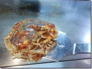 野菜にはもやしがなく、ひっくり返した後に生地の下に、これまた冷蔵庫から取り出されたチューブの水分、おそらく出汁だと思いますがこれを射します。そしてドーム型のフタをして蒸し焼き。その途中に、いったん上下を元のようにひっくり返してドーム状のフタをし少しの間焼いてから、再び上下を元に戻しました。このひっくり返しを一度元に戻す焼き方は、一銭洋食さんに似ていますね。こんな感じで、全体的にかなり時間をかけて丁寧に焼かれます。