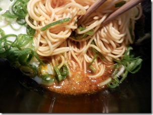 深くて黒色の鉢ですね。挽き肉とネギがやや多めにはいっています。麺は白色やや細めのストレート、タレは赤色です。