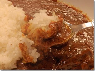 これがね、カレールーの中にゴロゴロ入っているんですよ。それも、ただ大きいだけではなくて箸で掴んでみるとゴムのように柔らかいんですね。この肉が、スパイシーでコクが強い、このカレーソースと、とってもよく合ってるんですよ。