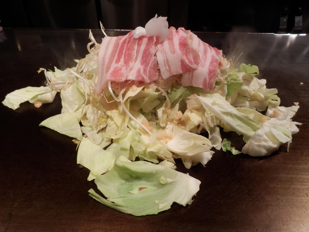 さて、お好み焼きです。常太郎さんのお好み焼きで何よりも驚くのが、その大きさなんですね。この焼きはじめの写真を見てください。これで一人前なんですが、バラ肉が5枚と、そこから野菜がこれだけはみ出ていることで、大きさが想像できると思います。出来上がりも、軽くピザのMサイズくらいはありますね。それから、キャベツがご覧のように、千切りではなく大型の乱切りなんですね。キャベツの大きさとバラ肉とを比較してみてください。