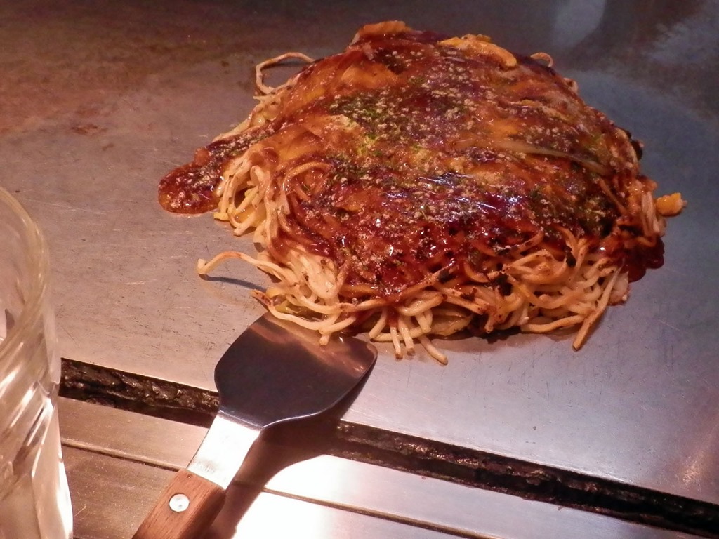 お好み焼きはすこし大きめで、見た目がパリっとしたいその麺と、半熟卵のお好み焼きです。焼くときに、時々生地をはがして野菜を丁寧に火を通されていました。