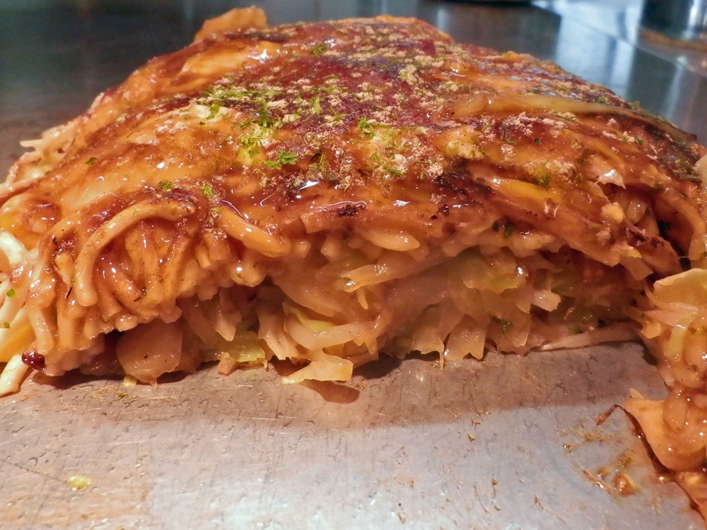 そして麺。この見た目に反して、パリパリなのは表面だけなんですね。内側は麺本来のやわらかさと弾力があって、全体的には、「パリっ」というよりも、「サクっ」のほうが近い感じです。フライケーキやアメリカンドッグのような、サクッと口当たりが良くて柔らかいお好み焼きです。