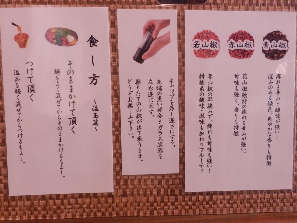 ですがここは、やっぱり汁なし担担麺と言えば山椒です。テーブルには三種類の山椒。丸い粒のままの山椒がミルに入っていて、回すと粗びきで出てくるのでが、この挽きたてが風味や舌触りがすごくいいんです。それぞれの山椒の特徴は写真を見ていただくとして、私は、酸味の加わった痺れ感がなんとも言えない青山椒と、すこし甘みを感じる若山椒の組合せが好きです。