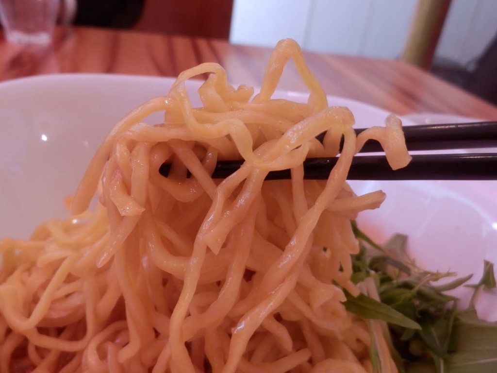 カレー風味以外にも、どことなく洋風の感じがする汁なし担担麺ですね。そういえば麻沙羅さんには、炙りチーズやチリトマトの汁なし担担麺や、豆乳ベースのスープが入ったスープ汁なしというメニューがあったり、麺も中華麺ではありますが、どこかパスタ風のような麺だったりしています。