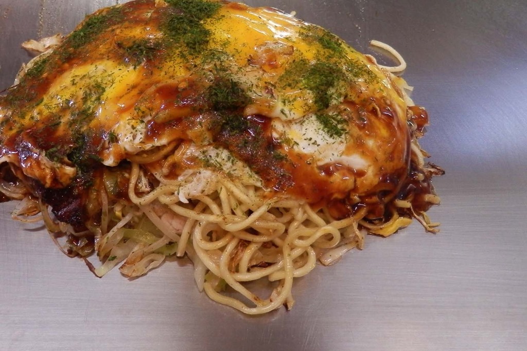 やまさ家さんのお好み焼きは、この表面に見える、半熟の黄身が特徴なんですね。お好み焼きを焼くときに、最後の仕上げで本体をたまごの上に乗せますが、やまさ家さんでは、玉子に二黄卵を使われ、そして、お好み焼きを乗せる際に2つある黄身の1つを横に避けておきます。そして、ひっくり返した後に、その避けておいた黄身を上に乗せて出来上がりとなります。なので、焼けた玉子の上に、さらに半熟の黄身が広がっている感じになるんですね。