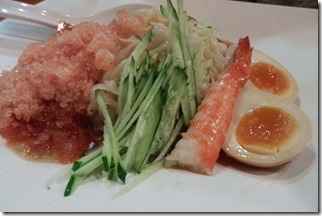 呉で食べられている冷麺と比べると、海老が大型で、玉子は薄い輪切ではなく、半分に切った半熟玉子です。