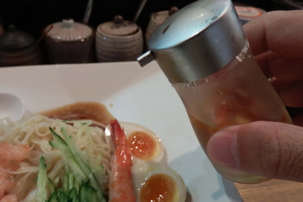 呉冷麺の特徴、唐辛子の入った酢もあります。甘くてピリッと辛い、そしてトマトの味がベストミックスです。
