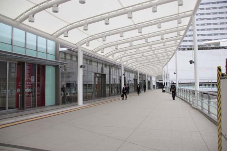 シュラトンホテル側から撮った全景です。右半分が開通しているのがわかると思います。駅舎中央部から駅舎にそってホテルグランビア南側に進み、そこから北側にグランビアにそって、道路をまたいで二葉の里までの間です。
